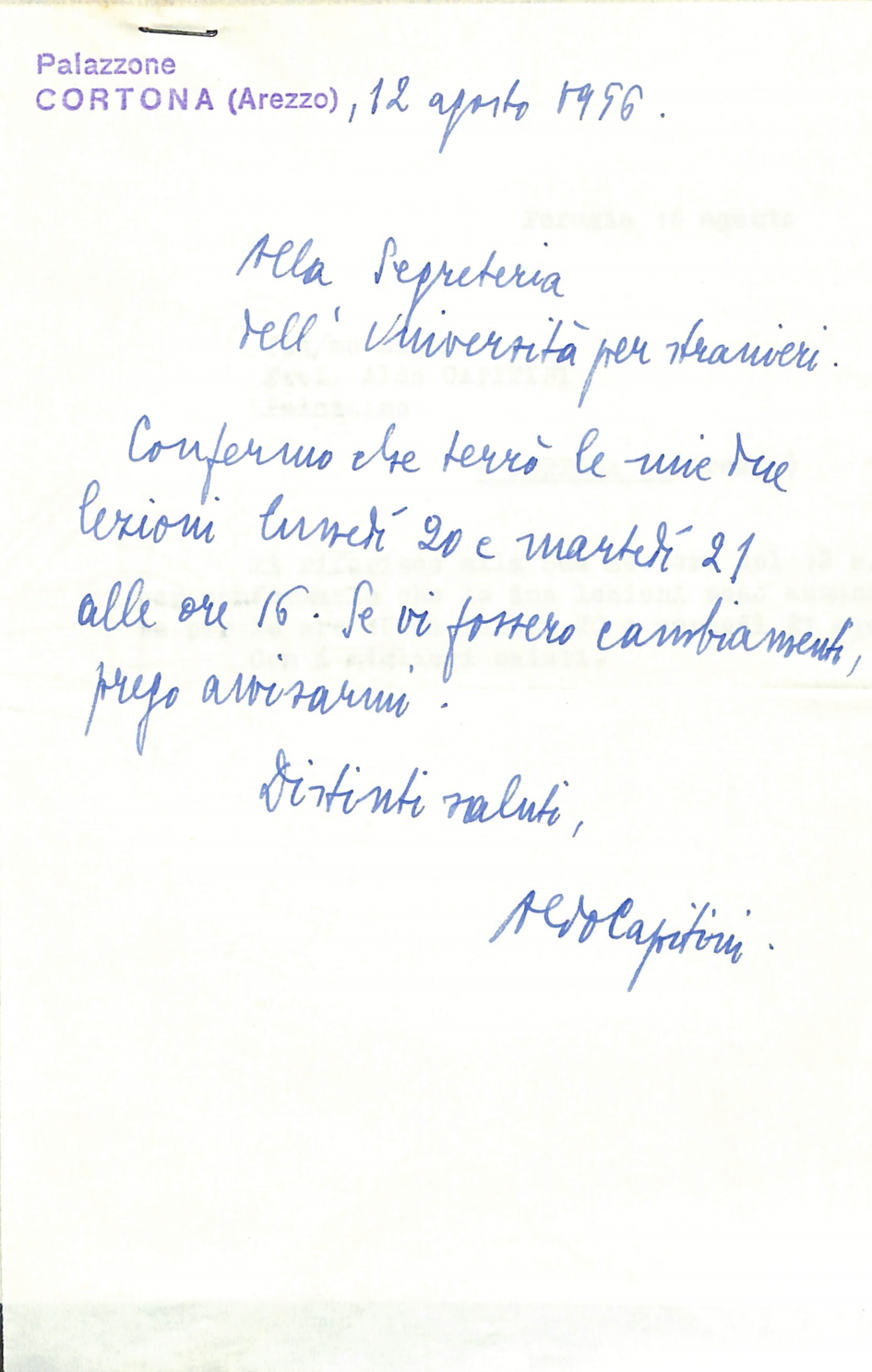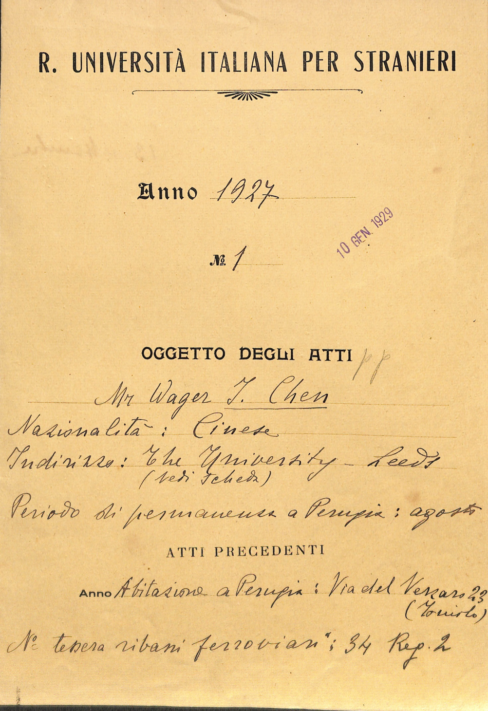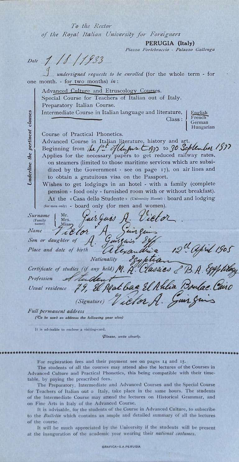 Per la storia e la descrizione dell’archivio si rimanda alla pagina SIUSA (Sistema Informativo Unificato per le Soprintendenze archivistiche link) dedica all’Università per Stranieri di Perugia e ai saggi di Maurizio Pagano (titolo e link pdf) e di Mori (titolo e link pdf), editi nel volume Treccani sopra citato.